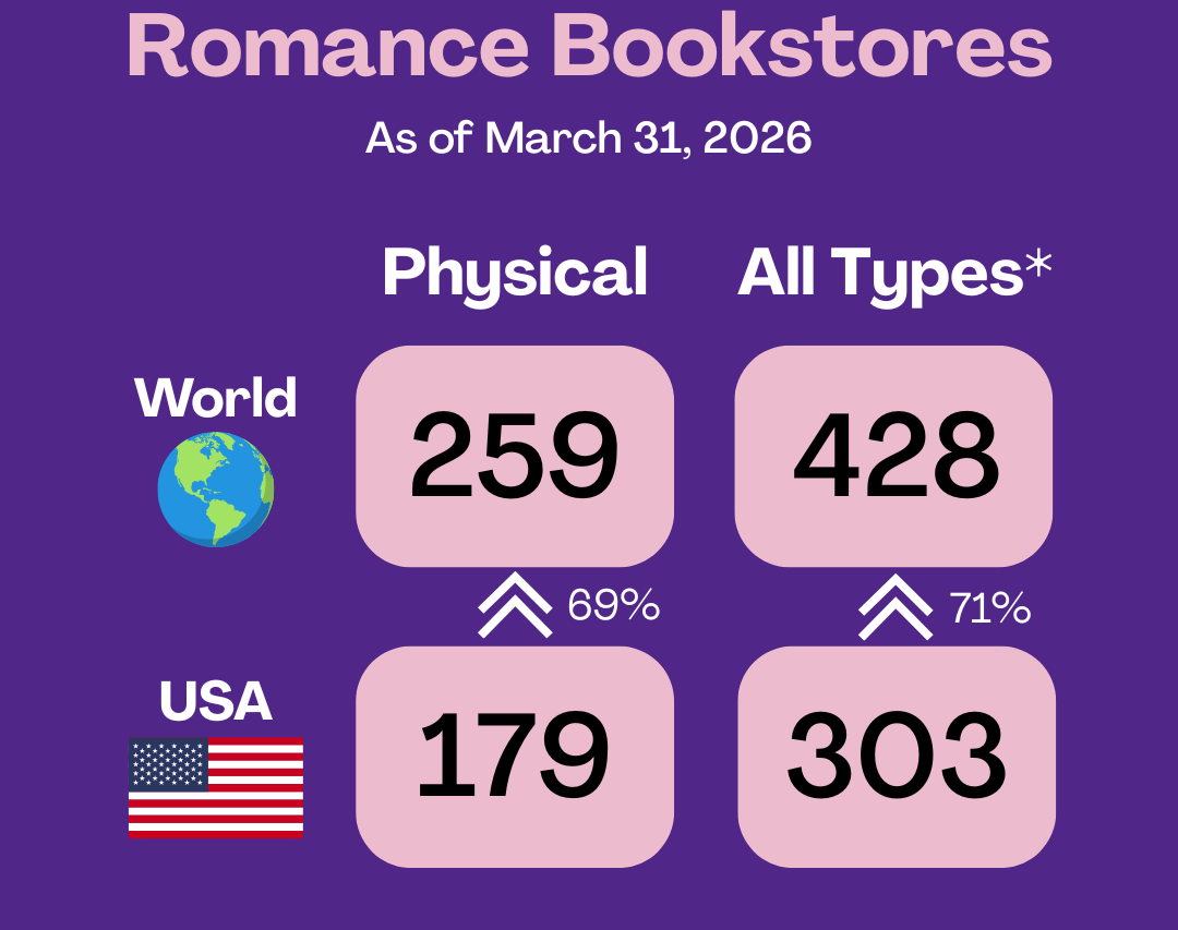 There are now 259 physical romance bookstores worldwide; 9 new physical stores opened in March.