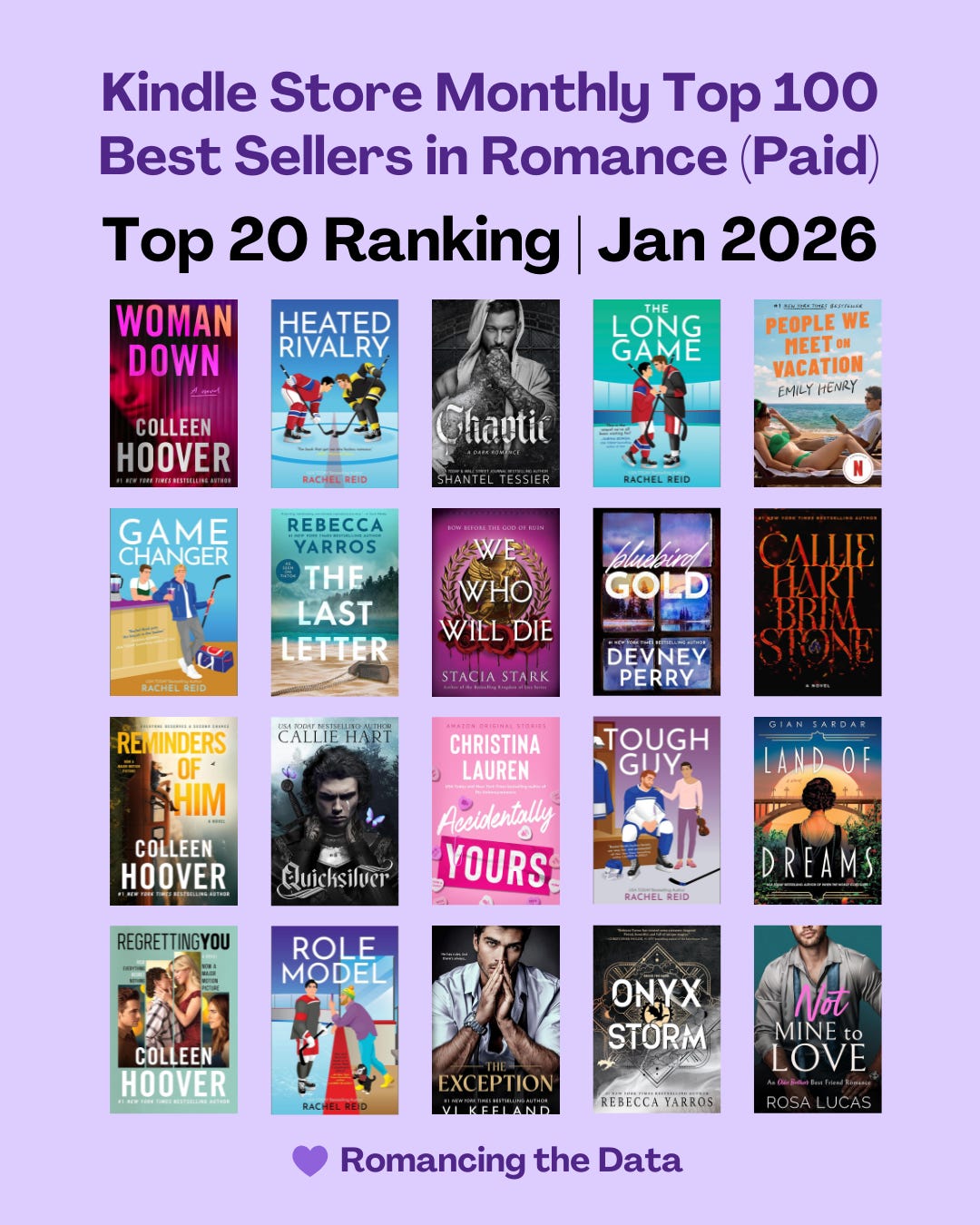 List: Amazon Kindle Store Top 100 Best Sellers in Romance (Paid), US Kindle Store. Data accessed from Kindletrends Romance Weekly Newsletter.1