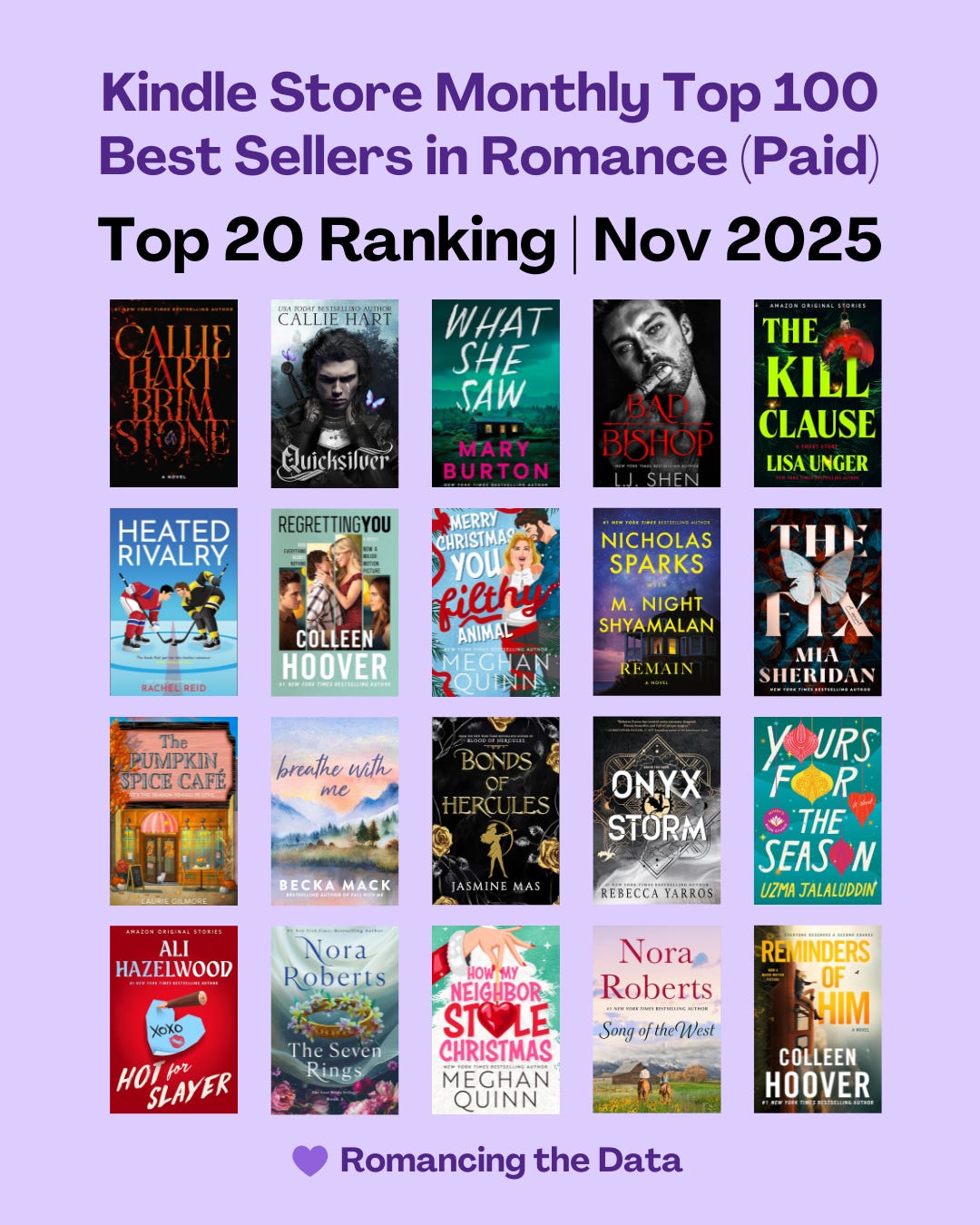 Methodology: This is an exclusive monthly ranking I’ve created in consultation with Kindletrends. It’s based on five Kindle Store Top 100 Best Sellers in Romance (Paid) lists pulled throughout the month (accessed from the Kindletrends Romance Weekly Newsletter: November 2, 9, 18, 23 and 30, 2025), which I’ve then compiled and ranked using a sum of ranks calculation. The Monthly Top 100 list generated is the basis for the analysis that follows.