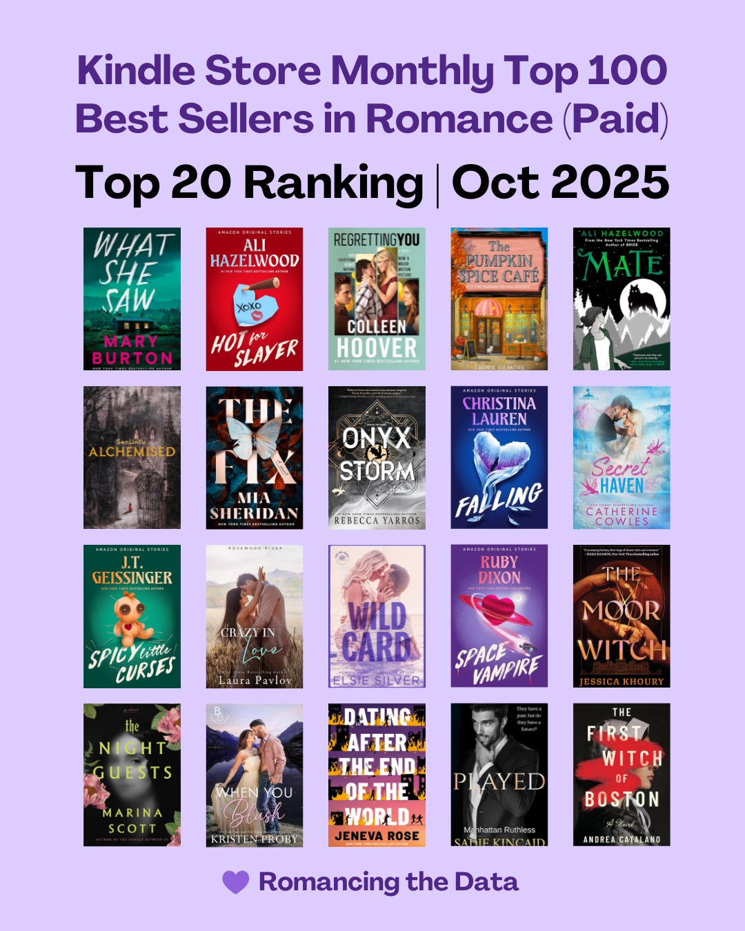 List: Amazon Kindle Store Top 100 Best Sellers in Romance (Paid), US Kindle Store. Data accessed from Kindletrends Romance Weekly Newsletter.1