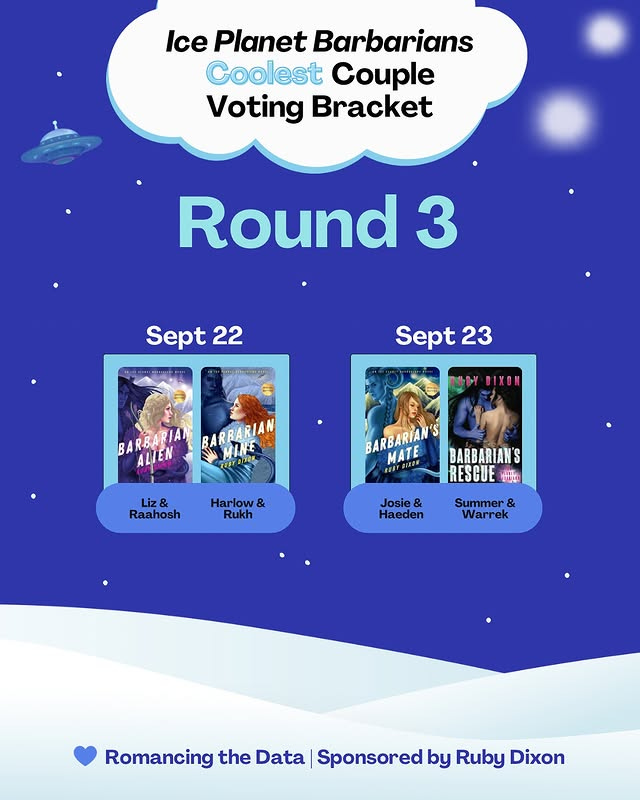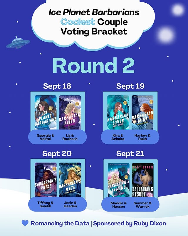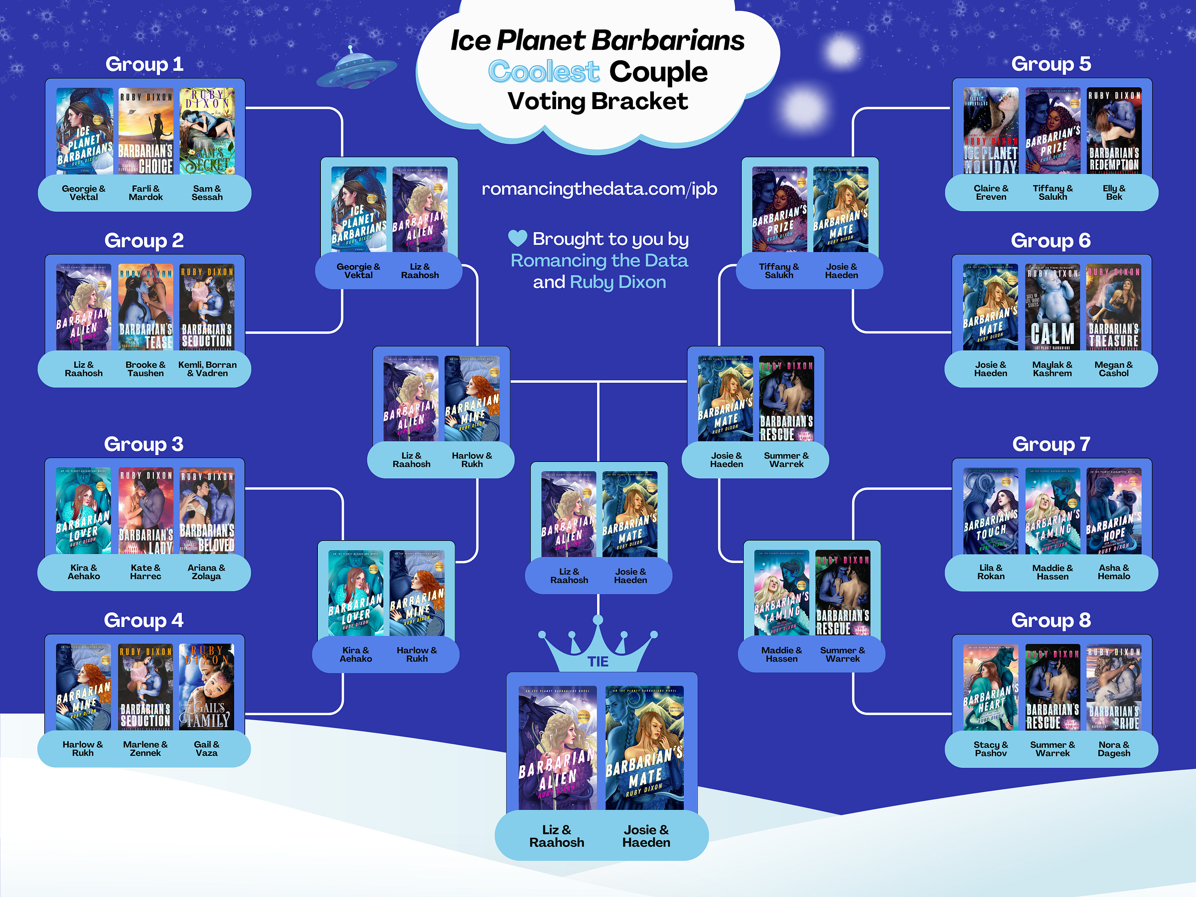 To celebrate, I’m partnering with author Ruby Dixon to host a voting bracket from September 10-24 to determine the “coolest” (aka the best) couple from the main Ice Planet Barbarians series. The couples will go head to head during two weeks of daily polls on Instagram!