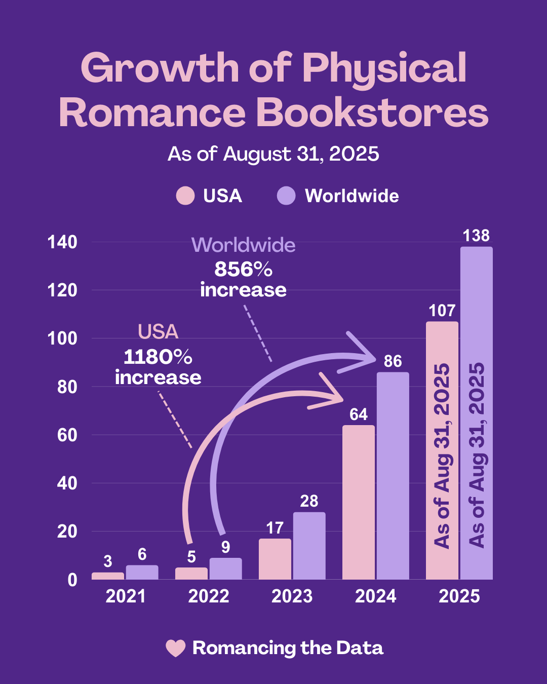 To date, there has been a net increase of 52 physical romance bookstores worldwide in 2025 (55 have opened, 3 have closed).