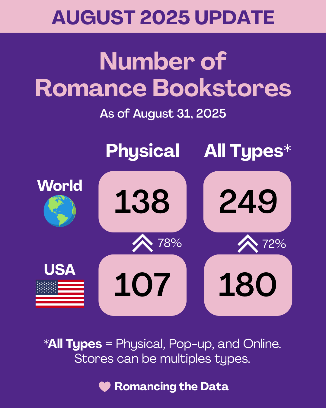 If we also include online and pop-up romance bookstores, the total number of stores grows to 249 (180 or 72% of which are in the United States).
