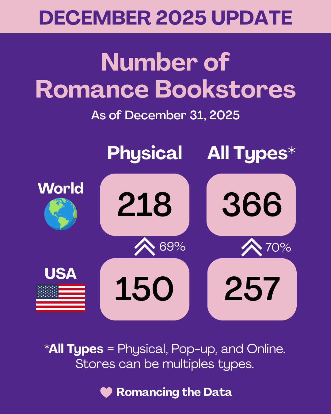 If we also include online and pop-up romance bookstores, the total number of stores grows to 366 (258 or 70% of which are in the United States).