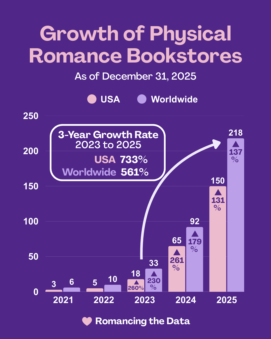 There was a 137% increase in physical romance bookstores worldwide in 2025, growing from 92 to 218 stores.