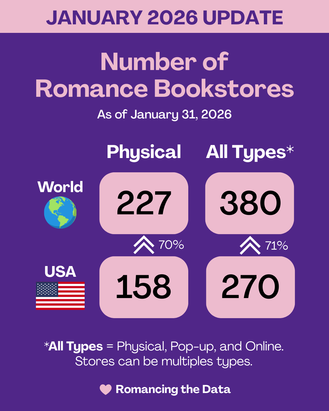There are now 227 physical romance bookstores worldwide; 8 new physical stores opened in January.