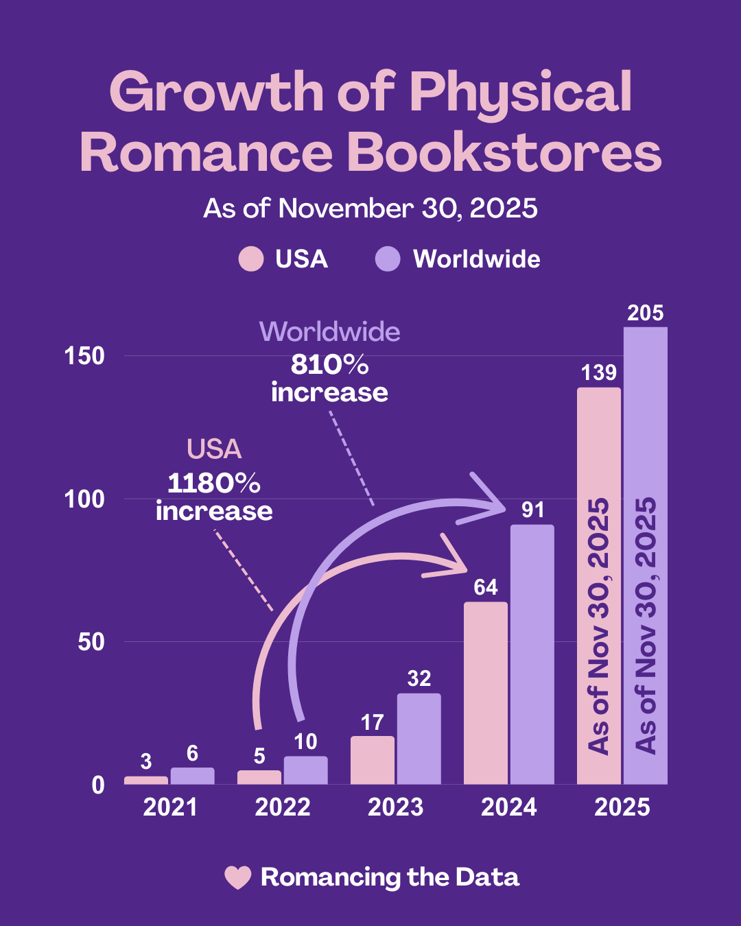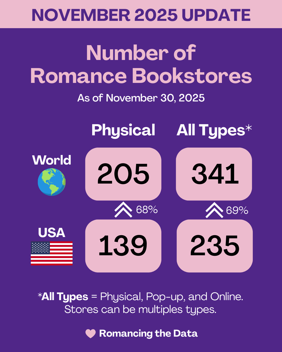 There are now 205 physical romance bookstores worldwide; 22 new physical stores opened in November.