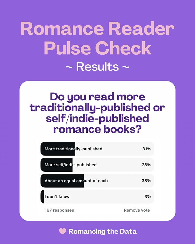 The question I’m reporting on today is: Do you read more traditionally-published or self/indie-published romance books?