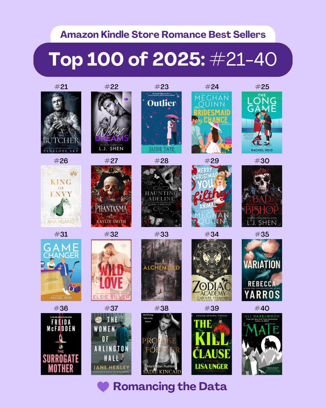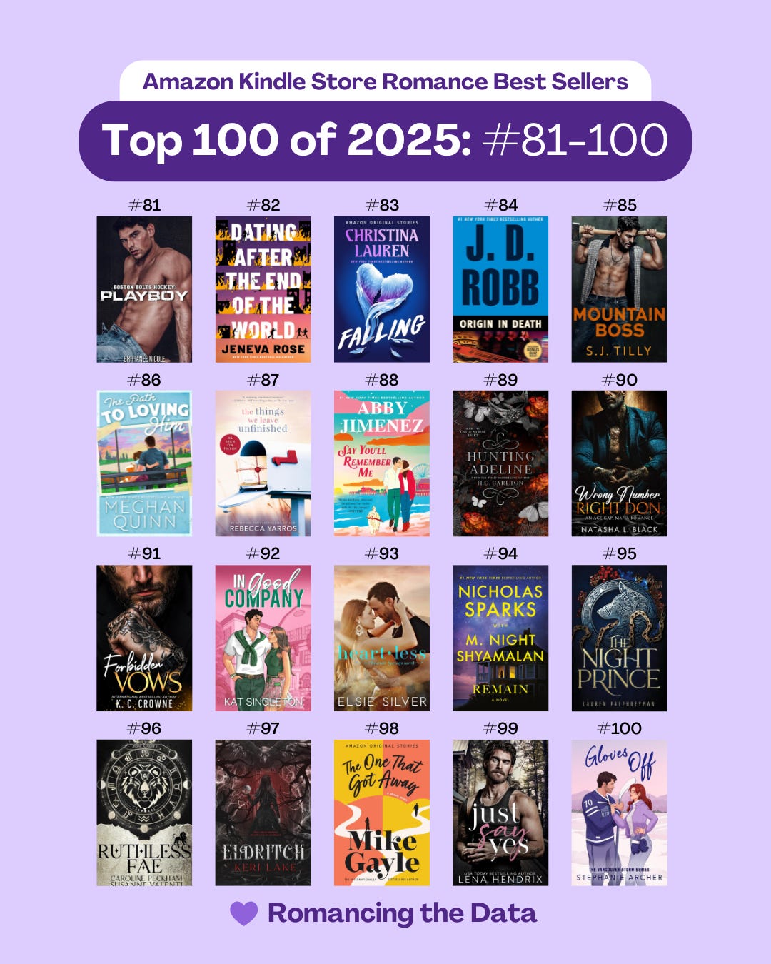 Methodology: This 2025 ranking is based on 52 Kindle Store Top 100 Best Sellers in Romance (Paid) lists pulled weekly throughout the year, which I’ve then compiled and ranked using a sum of ranks calculation.